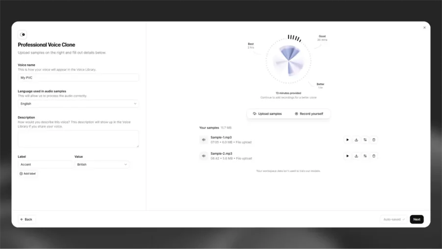 A Eleven é uma ferramenta avançada para geração de voz com IA, permitindo a criação de locuções naturais em diversos idiomas e estilos. Ela permite que você converta texto e crie vozes personalizadas a partir de gravações breves.