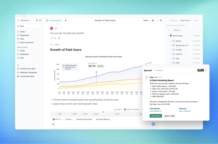 Julius AI é uma plataforma de análise de dados com inteligência artificial que permite que usuários “conversem” com seus dados em linguagem natural. Na prática, ao invés de escrever códigos ou fórmulas, perguntas como “Quais foram nossas vendas no último trimestre?” gera respostas com gráficos, tabelas, insights e até em linguagens de SQL e Phython.