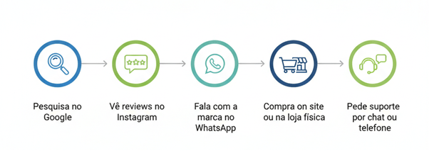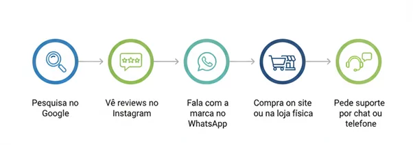 Ele não enxerga isso como etapas separadas. Tudo faz parte da mesma experiência! Já a jornada integrada on e offline acontece quando o digital impacta o físico. Na prática: o que acontece no físico retroalimenta o digital.